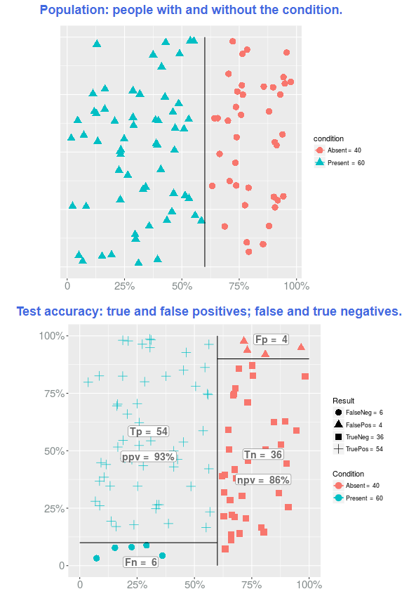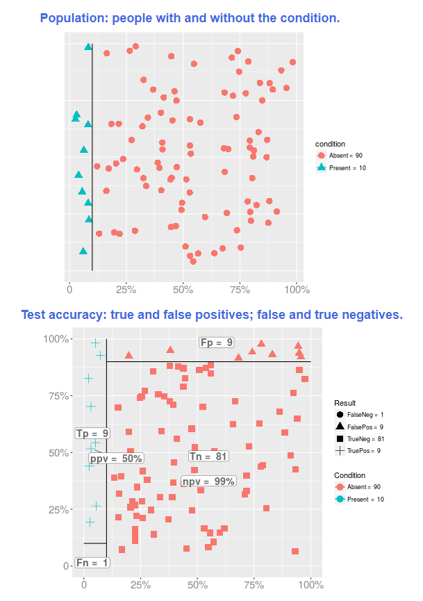 But let's look at that same decent test in a population where the condition is more rare (only 10% of the population have the condition):