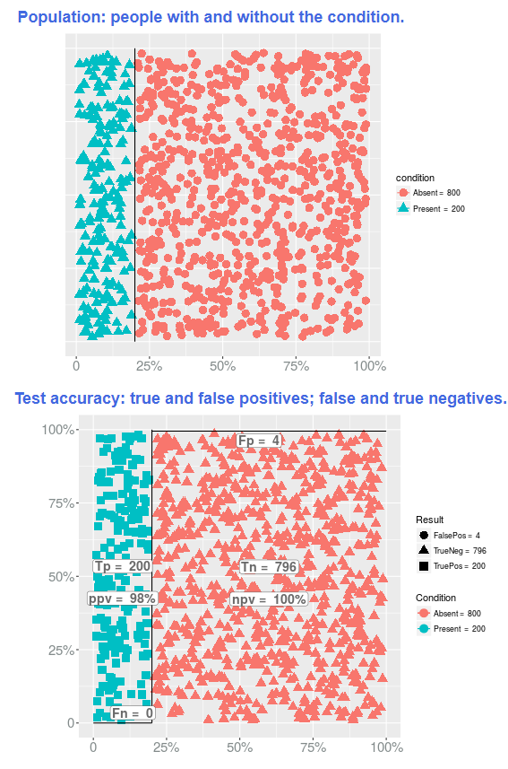 Unfortunately for the test accuracy (but gratitude for living here), if you use that same test on a random sample of people from Humboldt, where we think only 1 and 1/2 percent of people may have been infected, or possibly even fewer:| Condition present | Condition absent | Total | |