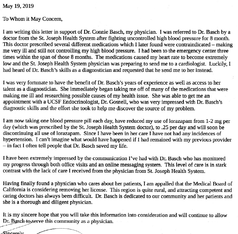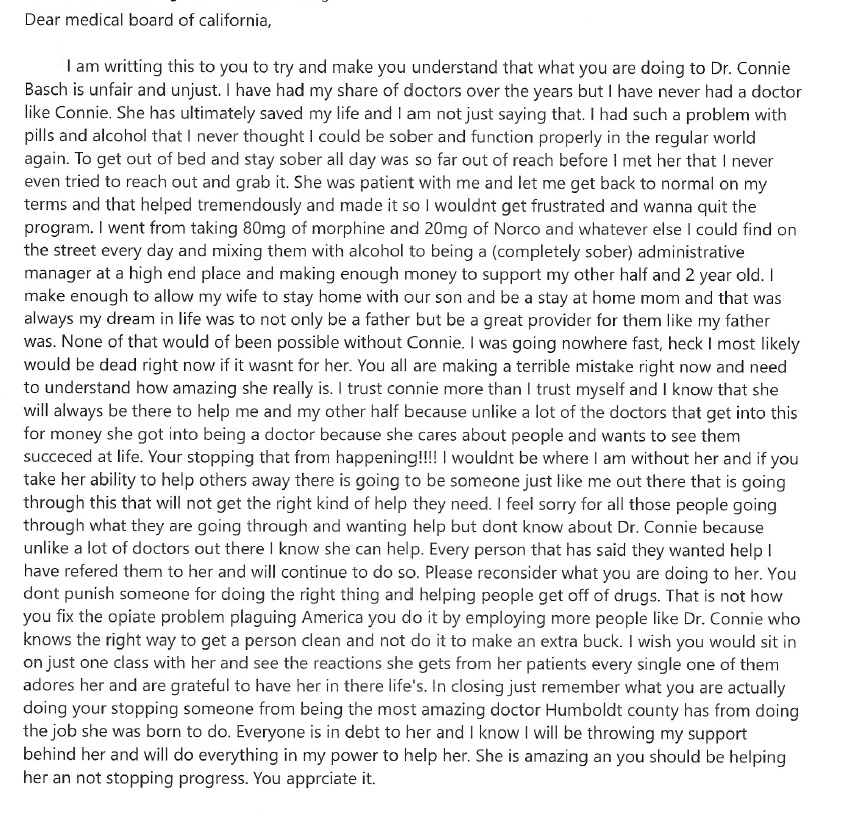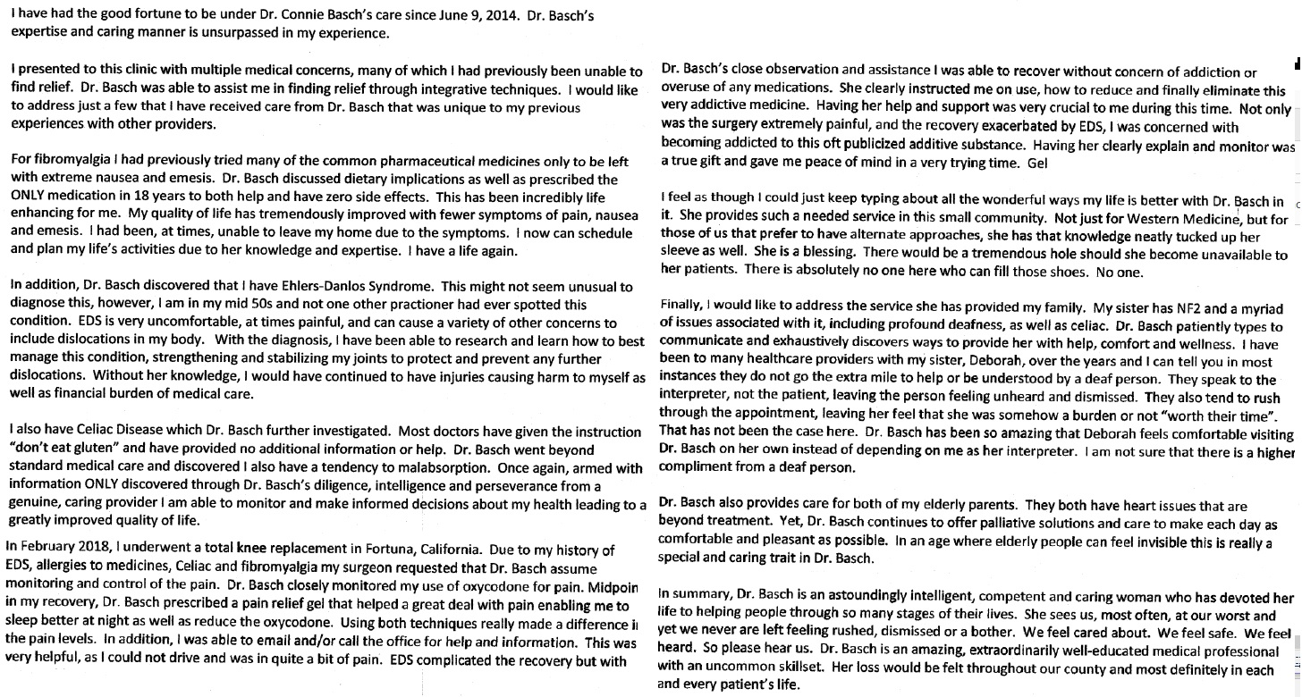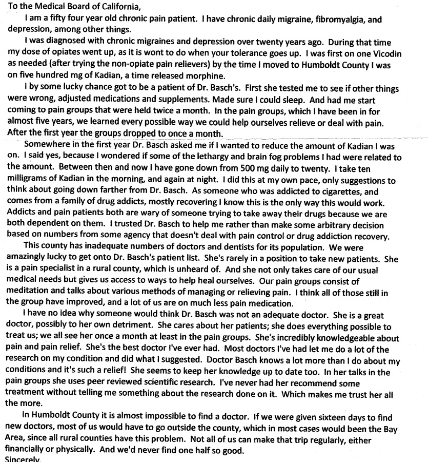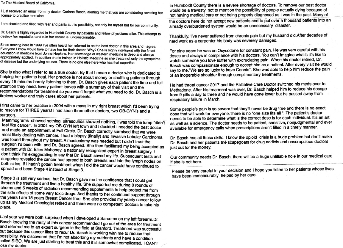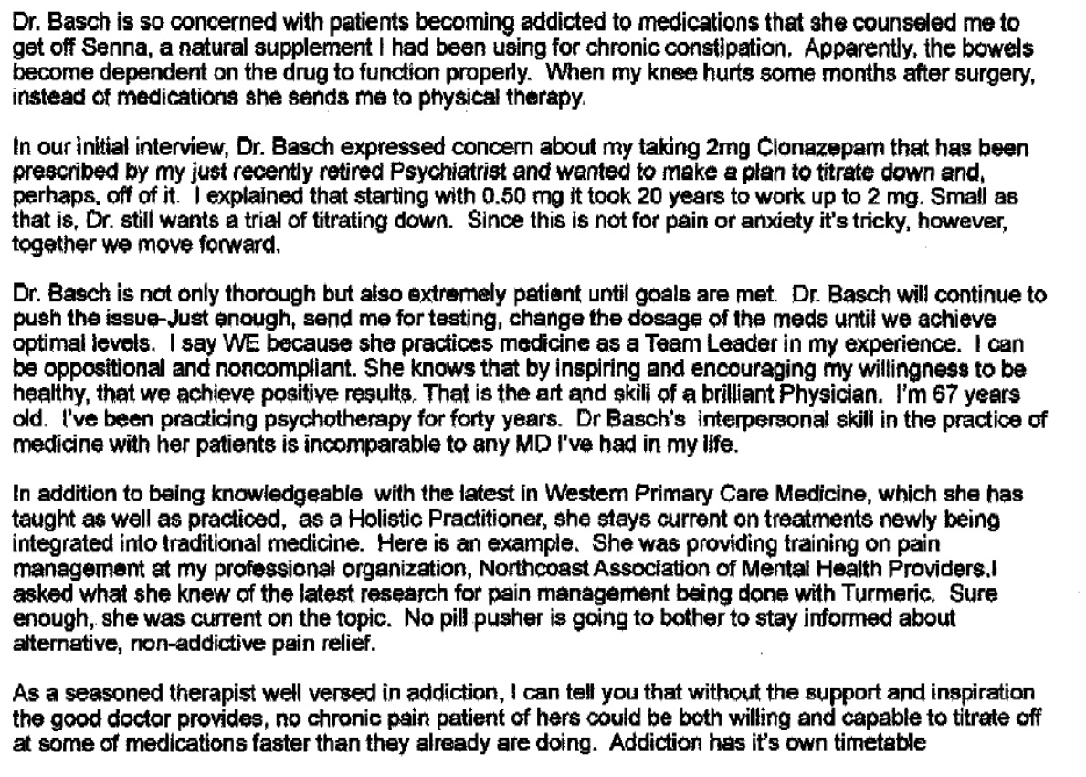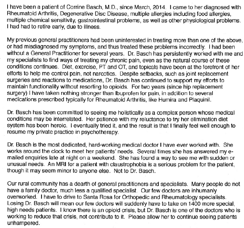 There are more than 350 patient letters which have arrived so far, and we are also told a number of people have sent letters directly to the Medical Board rather than to us. I am very touched by the letters, which have reminded me of so many of our shared journeys. It has been a privilege to serve the amazing patients who have made their way to my office, and you have all taught me so much.We are sharing a small subset of the patient letters we have received here, with the permission of the patients who shared them. The vast majority of these patients are on no controlled substances at all, and describe ways I have helped them with painful conditions without resorting to such drugs.