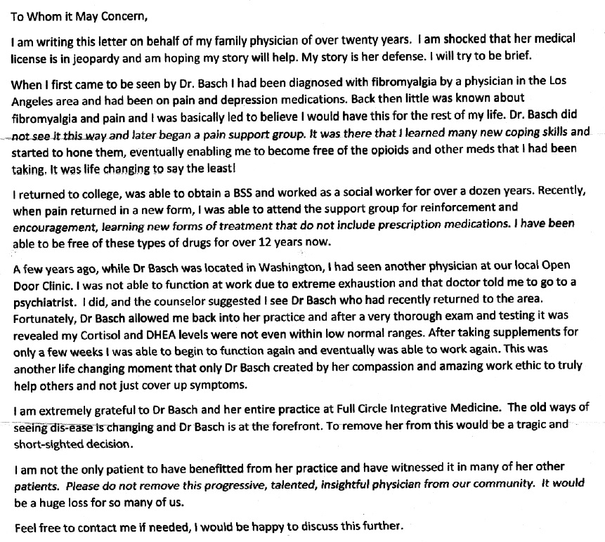 25 of my physician colleagues (MD's, DO's, and ND's) have submitted letters or declarations on my behalf, and a couple of others have expressed support but are concerned about speaking out formally because of concerns about drawing the eye of the Medical Board to their own practices (which I find particularly chilling.) I will here post a letter from Dr. Ingraham, a highly respected former President of the Humboldt Del Norte Medical Society and current chair of the Humboldt Health Foundation.Other Healthcare Providers